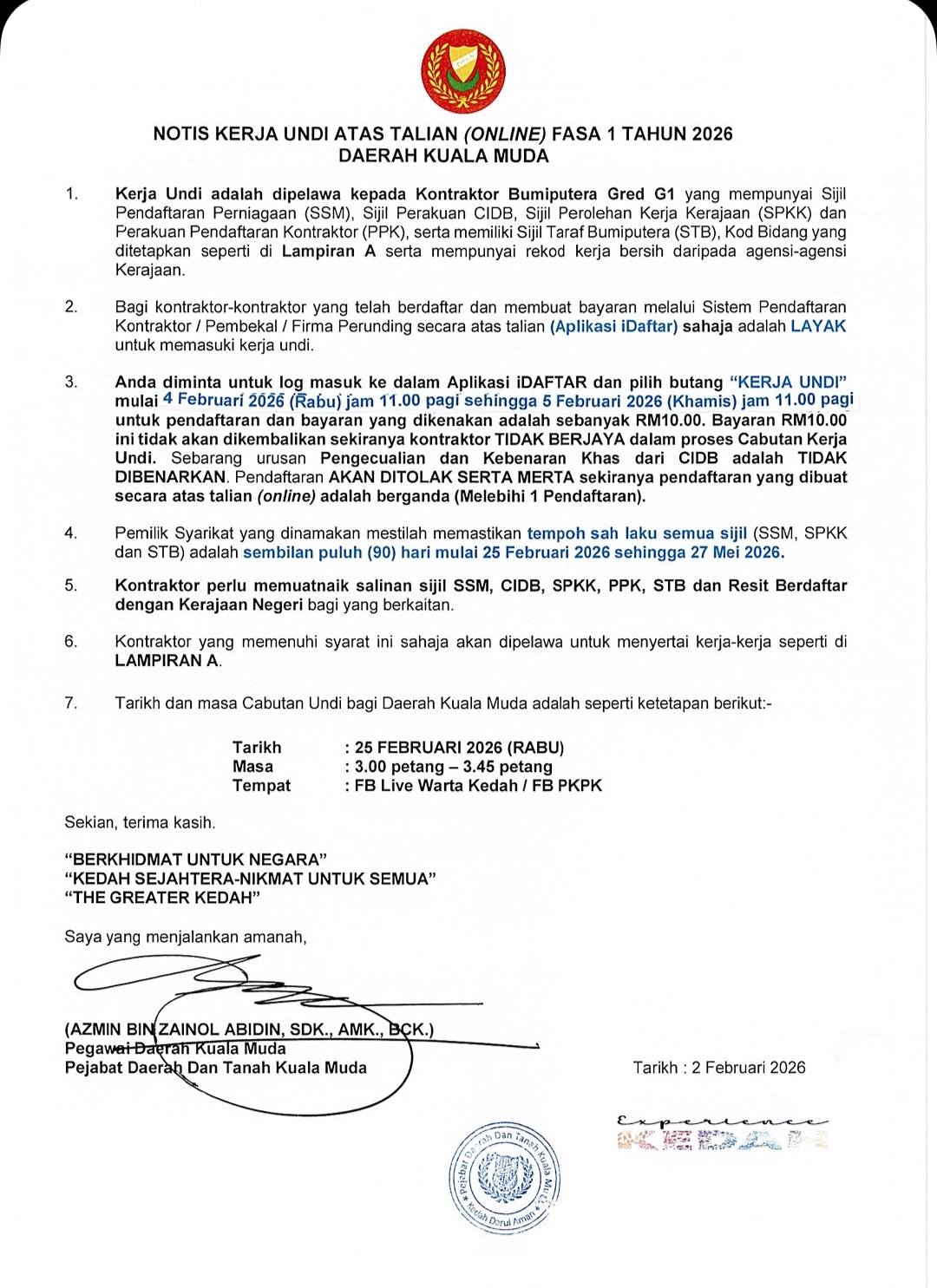 NOTIS KERJA UNDI ATAS TALIAN (ONLINE ) FASA 1 TAHUN 2026 DAERAH KUALA MUDA